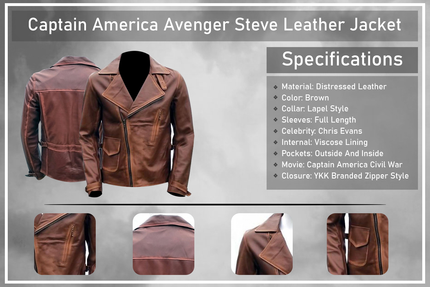 It is the time to get in an utmost sophisticated style with this Steve Roger leather jacket inspired by Chris Evan wardrobe portraying as Steve Roger in smash hit movie Captain America First Avenger. The jacket is being replicated as original as depicted in the movie. It has been finished in a dashing brown color that could really make a difference when worn casually. The distressed leather attire carries all the elements to turn heads towards you. Thanks to its distinctive detailing and a perfect vintage outlook!