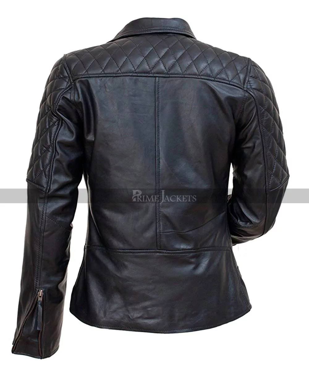 Ornament your personality with this classic piece of leather from the style roster of the beautiful Canadian singer Avril Lavigne. The jacket is fantastically created with premium leather to satisfy the taste palate of all female fashion mongers. With its captivating black quilted pattern at front and backside; the jacket denotes all design elements added with high attention to details. It has a captivating lapel style collar and a full front asymmetric zippered closure. There are two zippered pockets on both side and sleeves are trimmed in an appealing silhouette with zippers at cuffs. Enjoy a refined, tasteful appearance at the fullest and add this stunning leather wear into your closet right now.