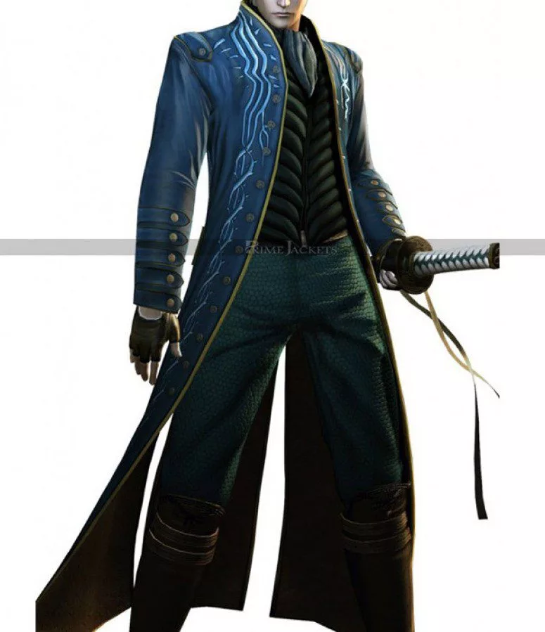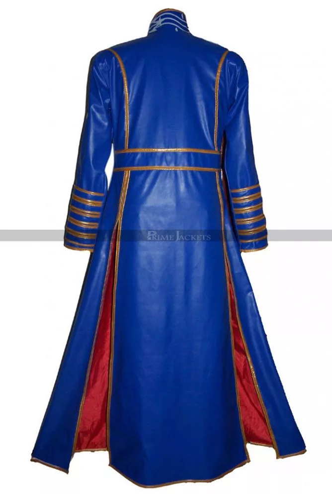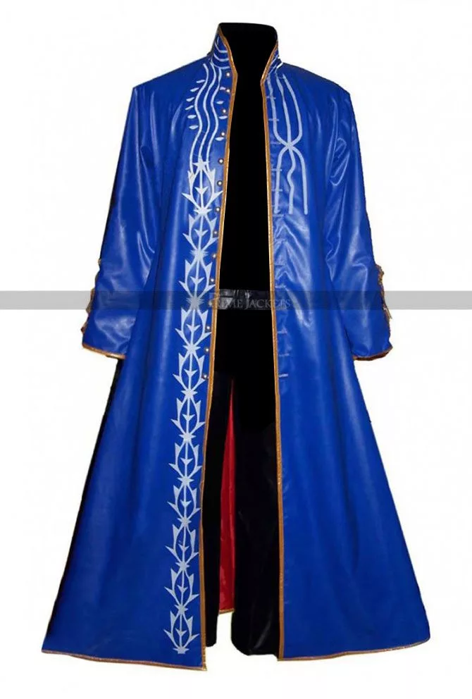 Be attentive! All the game lovers; here we are presenting an alluring costume coat from the famous series Devil May Cry. The astounding Vergil Coat is a signature style ensemble of the character Vergil and is here to inspire all his fans. The best quality leather is used to craft this masterpiece in captivating blue color. The front of Devil May Cry 3 Leather Coat is made extremely modish with a crisp, stylish erect collar and open front. A white designed emblem is applied on the edges of front closure that appears visually dazzling and attractive. Sleeves are long with open hem cuffs. A piping pattern is applied on back and cuffs for an exquisite look.