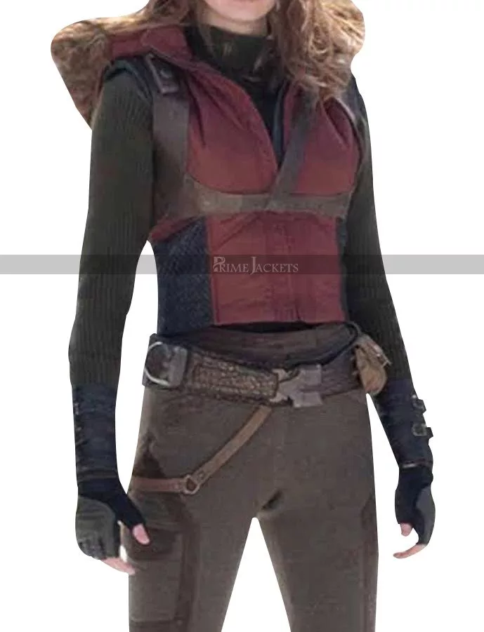 Have you fallen in love with actress Karen Gillan after seeing her in the movie Jumanji 3, especially the vest she wore in this movie? If yes, then you simply cannot miss this beautiful maroon vest that she wore while playing the character of Ruby Roundhouse. This sleeveless vest is made of faux leather and it is maroon in color. It is a perfect outerwear for all causal occasions in the outdoors. It keeps you warm and comfortable when taking part in adventure activities.