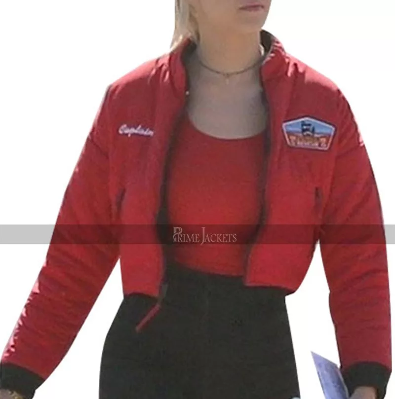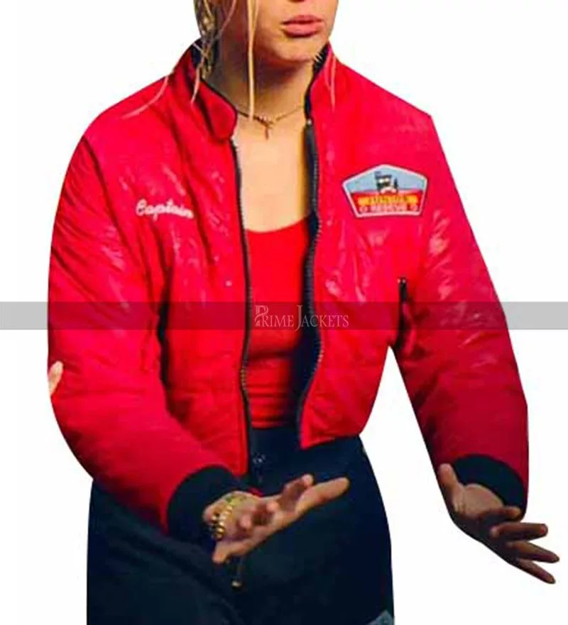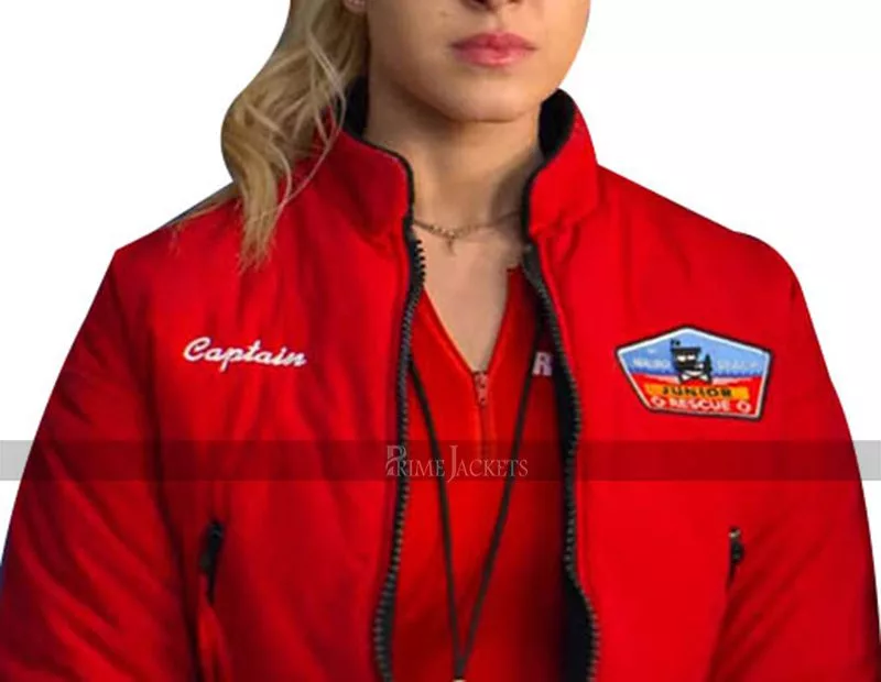 - The base of this Malibu Rescue Jackie R. Jacobson Jacket is red and there are logos on the front side, the front also has been provided with the zipper closure and pockets too.