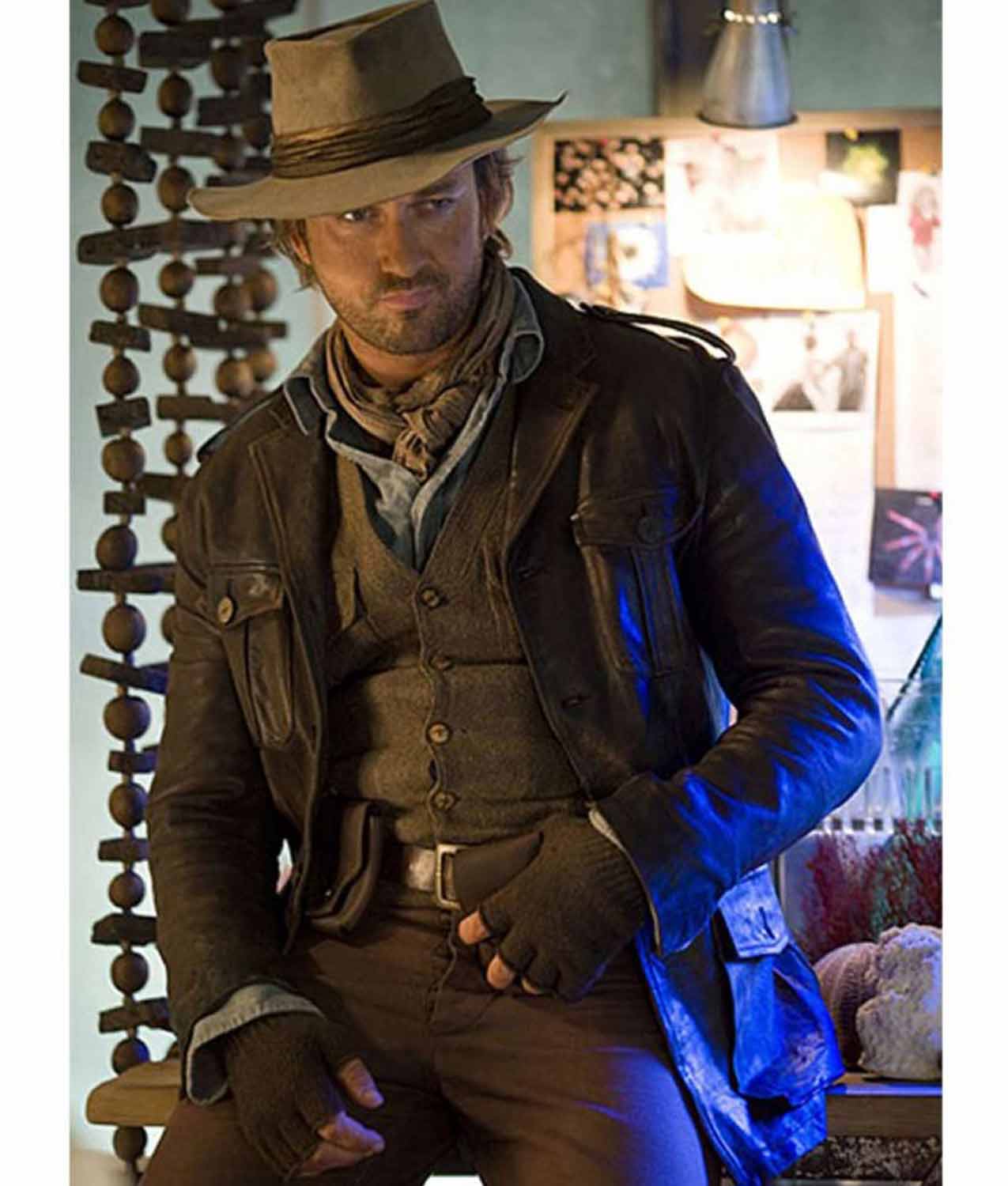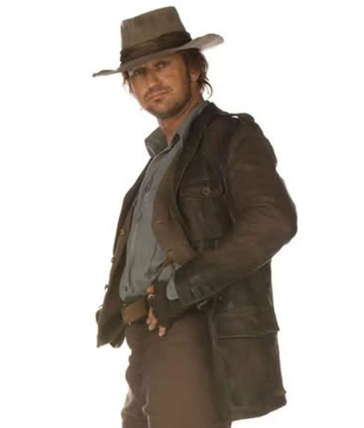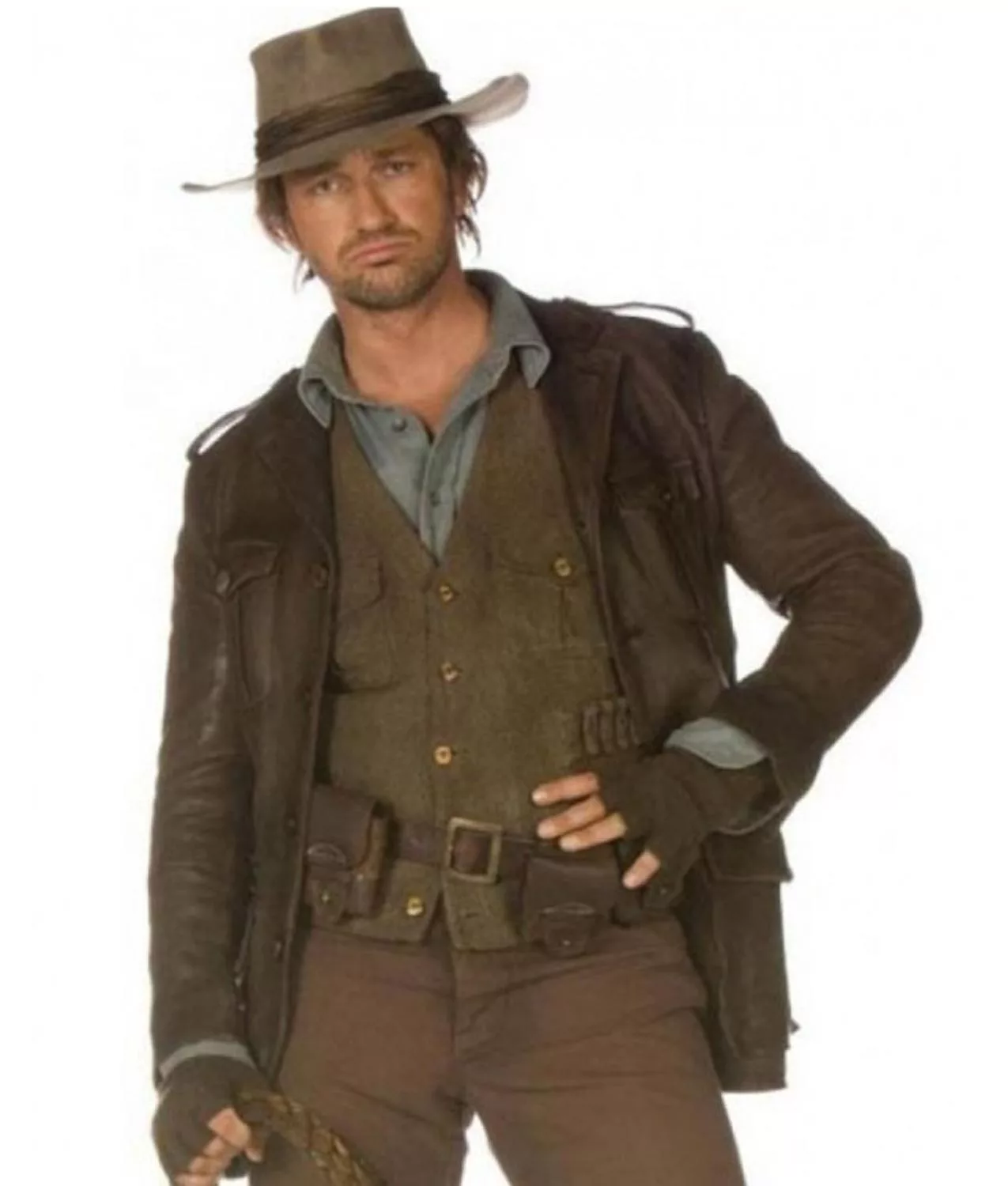 Reveal an effortlessly cool style with this stunning leather outfit. It is an inspirational garb taken from the fantasy/adventure movie Nim’s Island. Nicely styled by the dashing Gerard Butler; it has become a signature mark of Alex Rover character. Made with the best quality genuine or faux leather; the jacket carries all the loveable features in an impressive brown color. An alluring lapel collar gives an exciting visibility, while a prominent front buttoned closure brings in a gorgeous look and easy fastening. There are four flap pockets on front to give sufficient space for your valuable stuff.